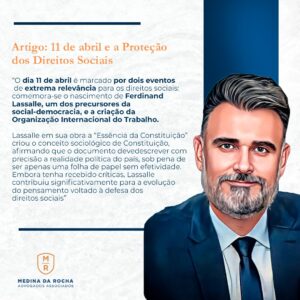 O dia 11 de abril é marcado por dois eventos de extrema relevância para os direitos sociais, comemora-se o nascimento de Ferdinand Lassalle, um dos precursores da social-democracia, e a criação da Organização Internacional do Trabalho.  Lassalle em sua obra a “Essência da Constituição” criou o conceito sociológico de Constituição, afirmando que o documento deve descrever com precisão a realidade política do país, sob pena de ser apenas uma folha de papel sem efetividade. Embora tenha recebido críticas, Lassalle contribuiu significativamente para a evolução do pensamento voltado à defesa dos direitos sociais.