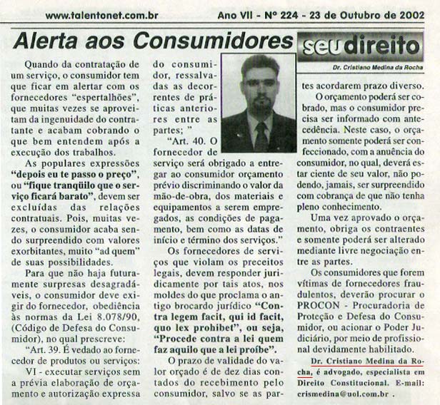No dia 23 de outubro de 2002, o Dr. Cristiano Medina da Rocha escreveu o artigo “Alerta aos Consumidores”. Leia o texto na íntegra: