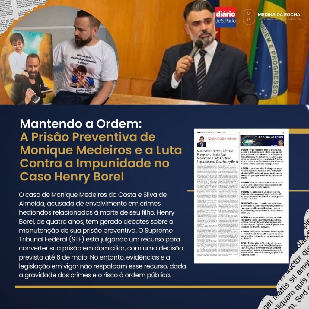 No recente cenário jurídico brasileiro, a discussão em torno da manutenção da prisão preventiva de Monique Medeiros da Costa e Silva de Almeida tornou-se um exemplo crucial da necessidade de resguardar a ordem pública e assegurar a integridade da instrução criminal e aplicação da lei penal. Monique é acusada, junto com Jairo Souza Santos Júnior, de crimes hediondos que resultaram na agônica morte trágica de seu filho, Henry Borel, de apenas quatro anos de idade, crimes que chocaram o país pela sua brutalidade e natureza.No dia 26 de abril, o STF iniciou o julgamento de um recurso que visa converter a prisão preventiva de Monique em domiciliar, cuja decisão será finalizada até o dia 06 de maio. A relevância deste julgamento não pode ser subestimada, dado o contexto e as implicações associadas ao caso.Monique, especificamente, é acusada de ser a garantidora dos atos perpetrados por Jairo, ressaltando sua participação não como uma espectadora passiva, mas como uma facilitadora e garantidora ativa dos crimes. As acusações que pesam sobre ela incluem homicídio qualificado e tortura, crimes que, por sua natureza, demandam uma cautela especial por parte do sistema judiciário. recurso da defesa de Monique Medeiros, que busca a conversão da sua prisão em domiciliar, não encontra respaldo nas evidências e na legislação vigente. Os crimes pelos quais ela está sendo acusada são de extrema gravidade e apresentam um risco real à ordem pública e à integridade do processo judicial.A Secretaria de Administração Penitenciária do Rio de Janeiro forneceu informações que contrariam a alegação de que a prisão está prejudicando seu estado psicológico. Monique recebe tratamento adequado, incluindo acesso a acompanhamento psicológico e atividades que preservam sua integridade física e mental, mitigando as preocupações sobre sua saúde no ambiente prisional.Em meio a um cenário marcado por um apelo público considerável e discussões intensas, o Ministro Relator Gilmar Mendes proferiu seu voto, que pode ser decisivo para o desfecho do caso. O ministro, reconhecido por suas análises profundas e meticulosas do direito e da jurisprudência, não apenas reiterou a importância da prisão preventiva no contexto atual, como também abordou as implicações legais e constitucionais envolvidas na manutenção da custódia de Monique.O Ministro Gilmar iniciou seu voto destacando a evolução legislativa que ampliou as possibilidades de atuação do assistente de acusação no processo penal brasileiro. Historicamente, o assistente de acusação tinha suas funções mais limitadas, mas mudanças significativas na interpretação da lei e evoluções doutrinárias, sobretudo após a promulgação da Constituição de 1988, permitiram uma participação mais ativa. Isso se reflete no reconhecimento da legitimidade do assistente de acusação em recorrer das decisões que concedem habeas corpus, superando assim a Súmula 208 do STF.Em seu voto, Mendes também enfatizou as mudanças introduzidas pela Lei 12.403/2011, que reformulou o artigo 311 do CPP, permitindo que, a pedido do assistente da acusação, entre outros, seja decretada a prisão preventiva em qualquer etapa da investigação ou do processo penal. Essa modificação legislativa, segundo o ministro, reflete um entendimento mais amplo da necessidade de garantir a ordem pública e a aplicação da lei penal, especialmente em casos que envolvem crimes de grande repercussão e gravidade.O ministro também discorreu sobre a adequação da prisão preventiva no caso de Monique Medeiros, destacando a gravidade dos delitos imputados a ela, que incluem homicídio qualificado e tortura de seu próprio filho, um menor de apenas quatro anos de idade. Gilmar argumentou que tais crimes, pela sua natureza e pelas circunstâncias em que foram cometidos, justificam plenamente a manutenção da prisão preventiva como uma medida necessária para evitar a obstrução da justiça e para assegurar a ordem pública.Além disso, o Ministro ressaltou que as tentativas de Monique de manipular testemunhas e de influenciar indevidamente os procedimentos judiciais, bem como sua atuação nas redes sociais, demonstram um comportamento que põe em risco a integridade do processo penal. Esses comportamentos, conforme exposto por Gilmar, reforçam a necessidade de uma medida cautelar rigorosa para garantir que a justiça possa ser feita de maneira eficaz e sem interferências.Por fim, o voto de Gilmar Mendes serve como um lembrete robusto da seriedade com que o sistema judiciário brasileiro deve tratar casos de alta complexidade e gravidade, e da importância de manter medidas cautelares firmes quando justificado pelas circunstâncias do caso e pela legislação vigente. Seu voto, portanto, não apenas reflete uma análise detalhada do caso em questão, mas também sublinha o compromisso do Judiciário com a manutenção da ordem pública e a garantia de um processo justo e íntegro.Neste momento de profunda consternação, a decisão do Ministro Gilmar Mendes de manter a prisão preventiva de Monique Medeiros ressoa como um eco da voz coletiva clamando por justiça. Em um país ainda abalado pela brutalidade desse caso, a manutenção da custódia não é apenas uma medida legal, mas um gesto de firmeza contra a impunidade e um passo necessário para curar as feridas de uma sociedade que busca respostas e conforto. Ao decidir pela manutenção da prisão, o Judiciário não apenas reforça seu compromisso com a lei, mas também honra a memória de uma criança inocente cuja vida foi tragicamente abreviada, e oferece um sinal de esperança de que a justiça, apesar de seus caminhos tortuosos, encontra maneira de afirmar-se em defesa dos mais vulneráveis. Baixe aqui o artigo publicado em 01/05/2024 Clique aqui para baixar o PDF Clique aqui ACESSAR A MATERIA