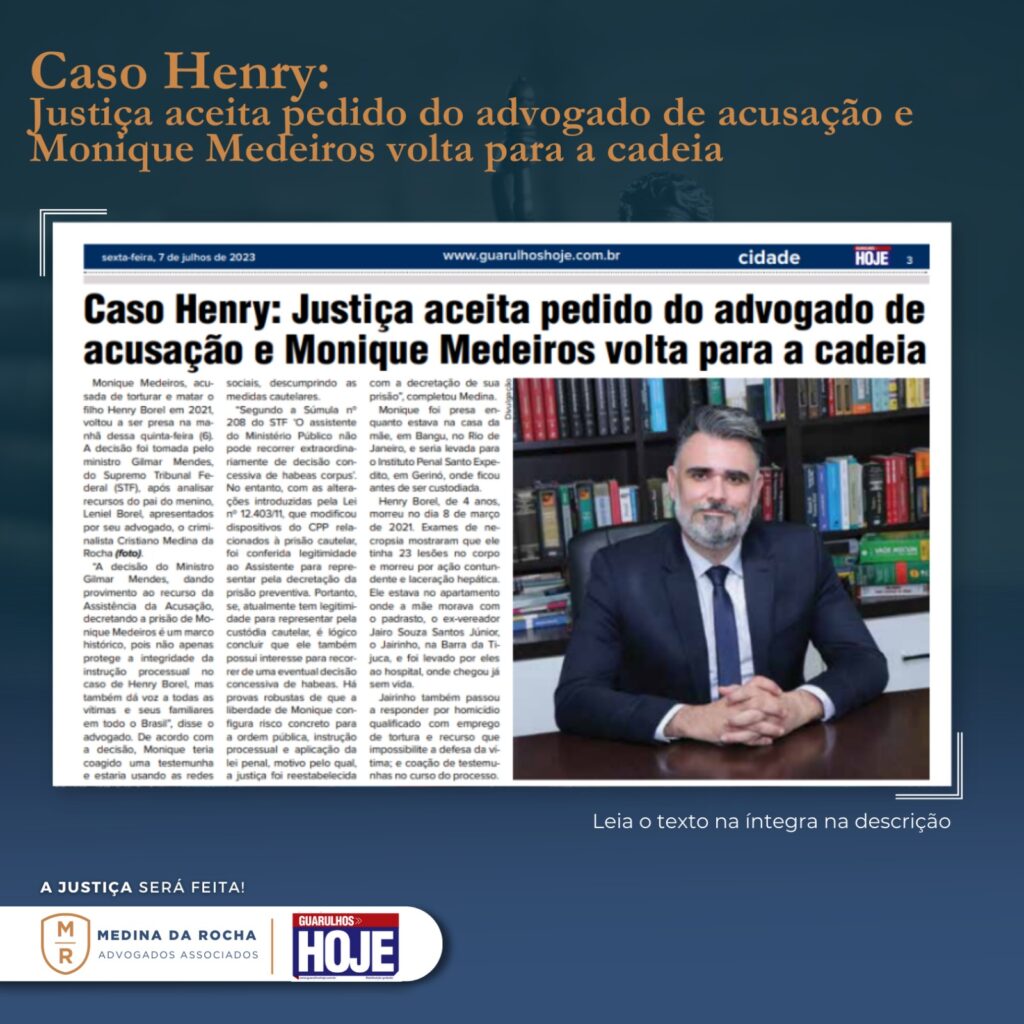 Monique Medeiros, acusada de torturar e matar o fi lho Henry Borel em 2021, voltou a ser presa na manhã dessa quinta-feira (6). A decisão foi tomada pelo ministro Gilmar Mendes, do Supremo Tribunal Federal (STF), após analisar recursos do pai do menino, Leniel Borel, apresentados por seu advogado, o criminalista Cristiano Medina da Rocha (foto). “A decisão do Ministro Gilmar Mendes, dando provimento ao recurso da Assistência da Acusação, decretando a prisão de Monique Medeiros é um marco histórico, pois não apenas protege a integridade da instrução processual no caso de Henry Borel, mas também dá voz a todas as vítimas e seus familiares em todo o Brasil”, disse o advogado. De acordo com a decisão, Monique teria coagido uma testemunha e estaria usando as redes sociais, descumprindo as medidas cautelares. “Segundo a Súmula nº 208 do STF ‘O assistente do Ministério Público não pode recorrer extraordinariamente de decisão concessiva de habeas corpus’. No entanto, com as alterações introduzidas pela Lei nº 12.403/11, que modifi cou dispositivos do CPP relacionados à prisão cautelar, foi conferida legitimidade ao Assistente para representar pela decretação da prisão preventiva. Portanto, se, atualmente tem legitimidade para representar pela custódia cautelar, é lógico concluir que ele também possui interesse para recorrer de uma eventual decisão concessiva de habeas. Há provas robustas de que a liberdade de Monique confi gura risco concreto para a ordem pública, instrução processual e aplicação da lei penal, motivo pelo qual, a justiça foi reestabelecida com a decretação de sua prisão”, completou Medina. Monique foi presa enquanto estava na casa da mãe, em Bangu, no Rio de Janeiro, e seria levada para o Instituto Penal Santo Expedito, em Gerinó, onde fi cou antes de ser custodiada. Henry Borel, de 4 anos, morreu no dia 8 de março de 2021. Exames de necropsia mostraram que ele tinha 23 lesões no corpo e morreu por ação contundente e laceração hepática. Ele estava no apartamento onde a mãe morava com o padrasto, o ex-vereador Jairo Souza Santos Júnior, o Jairinho, na Barra da Tijuca, e foi levado por eles ao hospital, onde chegou já sem vida. Jairinho também passou a responder por homicídio qualifi cado com emprego de tortura e recurso que impossibilite a defesa da vítima; e coação de testemunhas no curso do processo. Baixe agora essa notícia em pdf Clique aqui para ler a matéria na íntegra Baixe agora essa notícia em pdf Clique aqui para ler a matéria na íntegra